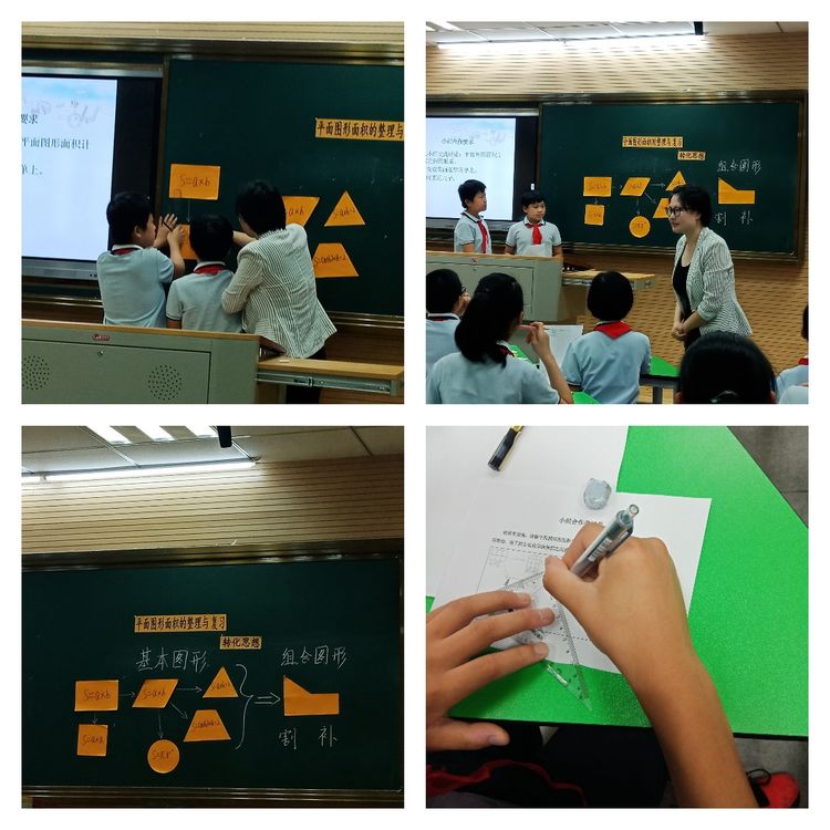 第一环节:由数学组方菲菲老师执教六年级《平面图形面积的复习与整理》一课。方菲菲老师由“学校要铺一块草坪,求这块草坪的面积是多少?”这个问题引入,复习了用割补法来解决数学面积计算问题,然后让学生采用剪一剪,拼一拼等方法整理出长方形,正方形,三角形,梯形,圆形的面积公式。接着方老师让孩子在小组合作中进一步探索、明白各面积公式之间的联系。孩子不仅明白用长方形的面积公式可以推导出其他图形的面积公式,还可以用其他方法计算图形的面积,让学生在学的过程中将转化的数学思想得到了进一步的升华。