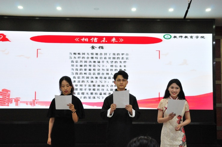 百年风雨飘摇,百年跌宕起伏,百年初心依旧,百年历久弥坚,中国共产党走过了坎坷与荆棘,品尝了屈辱与血泪,更创立了无数的伟大业绩。“忆往昔风雨兼程岁月如歌,看今朝百年华诞风华正茂”,值此佳际,5月16日晚,我院师范技能训练工程系列活动之“颂诗迎百年”朗诵决赛在17幢112报告厅顺利进行。在诵读经典诗文中,锻炼师范生基本技能,品味中华民族优秀文化,共庆中国共产党100周年华诞。本次比赛由我院工会主席、国家级普通话测试员黄良英老师,院应用心理学专业系主任李新宇老师,院团委书记兼学工办主任叶青老师,院辅导员蒋栩璐老师、蒲伟军老师担任评委。