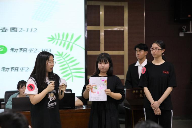 第一个上场的是来自杏园女寝8-403的六神花露水寝室,小学教育专业的她们通过对游戏化教学的思考,想到可以用游戏导入一个新的知识点,也可以用游戏复习学过的知识。一堂简短的模拟课、一局“你来比划我来猜”的游戏,将她们的专业知识与团体协作的打卡内容完美融合。
