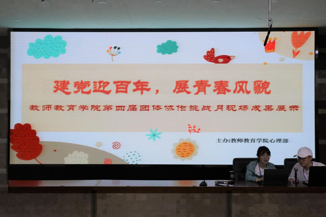 恰逢中国共产党成立一百周年即将来临,习近平总书记在新年贺词中对中国青年提出殷切希望:“站在‘两个一百年’的历史交汇点,全面建设社会主义现代化国家新征程即将开启。征途漫漫,惟有奋斗。我们通过奋斗,披荆斩棘,走过了万水千山。我们还要继续奋斗,勇往直前,创造更加灿烂的辉煌!”而当代青年“佛系”“丧”“内卷”等现象层出不穷。为了更好地帮助同学们告别丧文化,培养积极心理,充实生活,完善自身,为复兴中国梦贡献自己的力量做好准备。教师教育学院心理辅导分站特开展“迎建党百年,展青春风貌”——团体协作挑战月活动。5月7日晚,教师教育学院“团体协作挑战月”活动决赛于17幢112报告厅举办。初阳学院学工办主任曹玮老师、辅导员蒋栩璐老师、教师教育学院辅导员蒲伟军老师出席并担任了本次活动的评委。