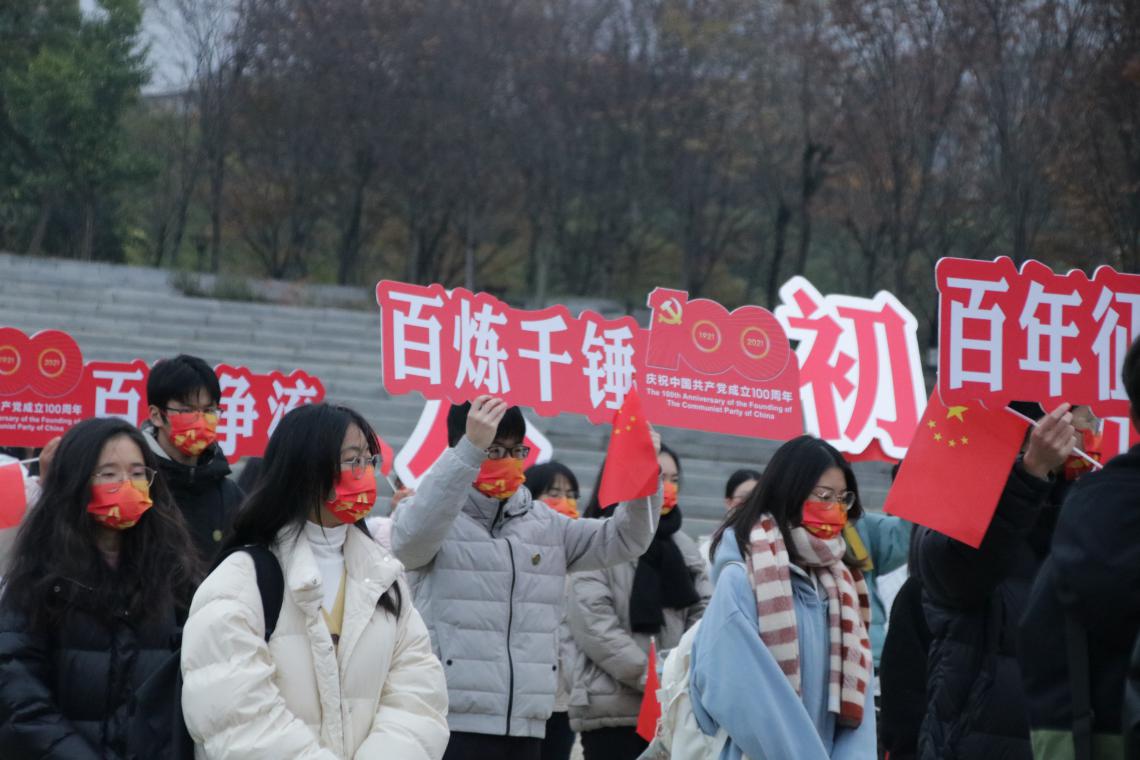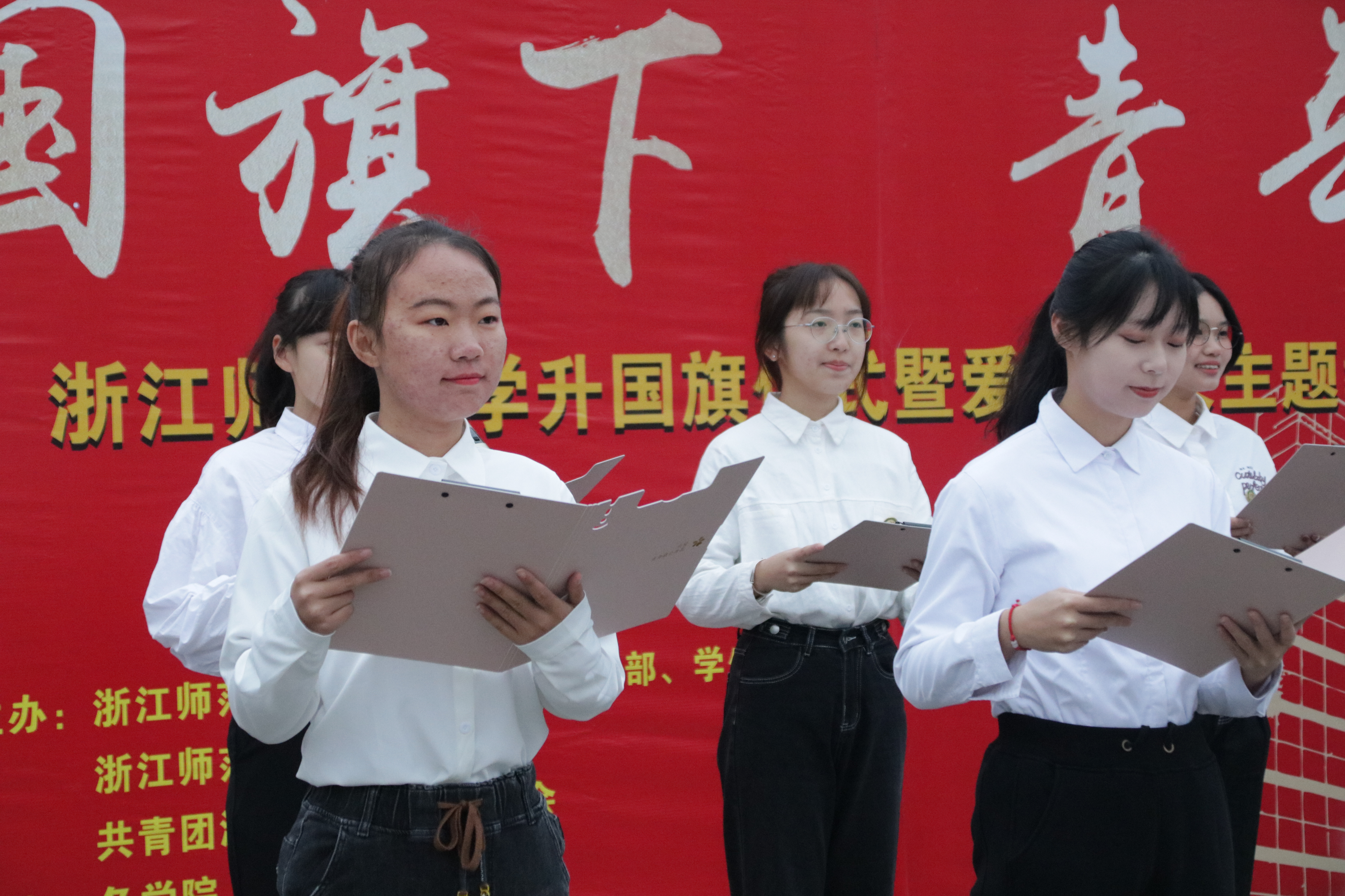 活动的第一项议程是升国旗,唱国歌。国旗护卫队铿锵有力的踏步声踏破了清晨的迷雾,国旗是一抹壮丽的中国红照耀在浙师学子的眼中。望着鲜艳的国旗徐徐升起、迎风飘扬,心中充满着祖国更加繁荣昌盛的期许。