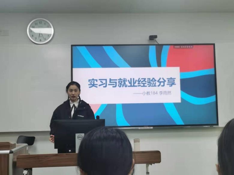 李雨然和陈瞳首先进行了实习与就业方面的经验分享。围绕实习工作的回顾、实习心得体会、就业经历三个方面,她们向同学们展开讲解,并从自己的亲身体会出发为同学们提供宝贵实用的就业经验与建议。李雨然表示,实习非常重要,在实习时,个人可以充分参与到课堂授课和班级管理中去,真实感受教师的状态,因此在实习过程中,自己的能力能够得到极大的锻炼和提升;除此之外,实习过程中能接触到各种不同的学生,获得大量的个案,一些学术教研工作也能够顺利展开。陈瞳提醒同学们,就业面试时,不盲目,多听多看多了解;笔试面试提前准备,不打没有准备的仗;面试需自信,扬长避短需牢记;重视实习,实现自我提升。