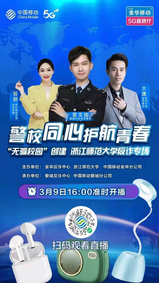 在诈骗活动日益猖獗的当下,反诈宣传不容懈怠。3月9日,为帮助同学们更好地了解和掌握反诈知识,增强自我保护意识,金华反诈中心联合我校举办了“警校同心 护航青春 创建平安浙师”网络直播活动,邀请同学们参与观看学习。
