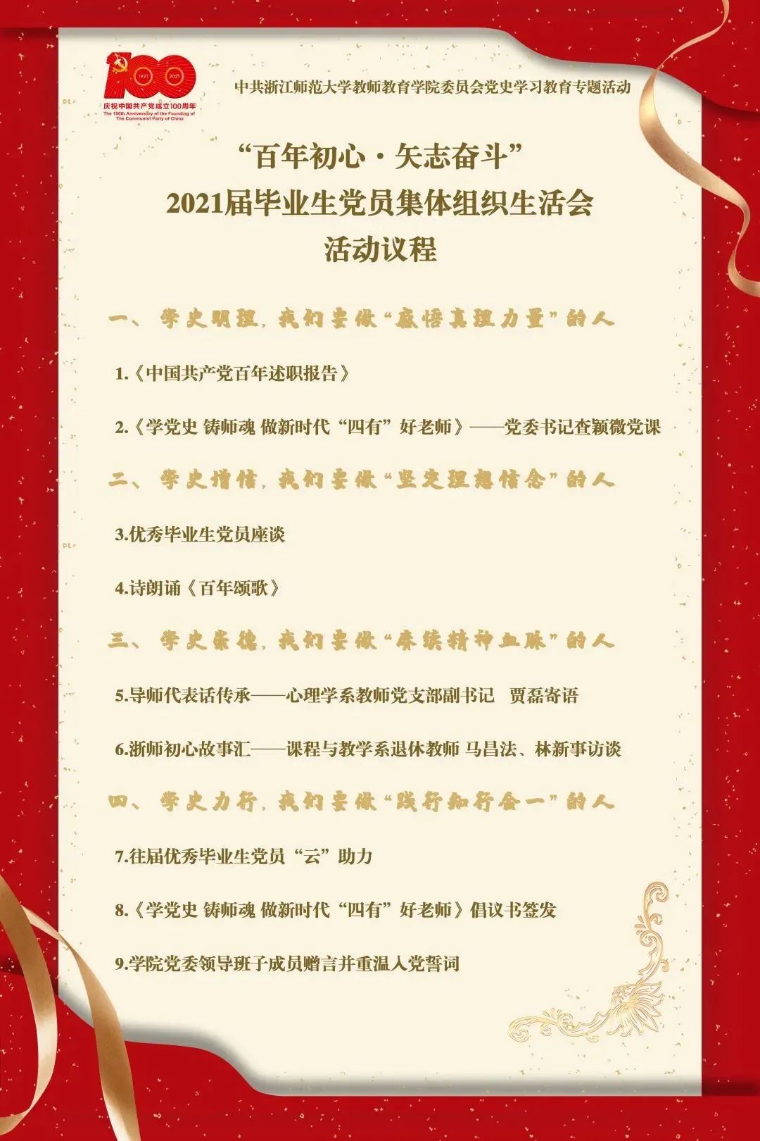 2019年以来,浙江师范大学教师教育学院党委积极探索组织育人新模式,创新党史学习教育方式方法,始终牢记为党育人、为国育才使命。适逢毕业季,为深入学习贯彻习近平总书记在党史学习教育动员大会上的重要讲话精神、充分发挥组织生活会的育人功能,学院党委为全体毕业生党员精心策划离校前最后一次集体组织生活会,激励毕业生党员从党史学习中汲取智慧和力量,坚定立业报国志向,在新时代伟大实践中勇担使命。