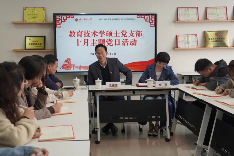 党建引领明方向,扬帆启航新征程。作为全国高校“百个研究生样板党支部”培育创建单位,教师教育学院教育技术学硕士党支部于10月26日在17-711党员教授工作室开展十月份主题党日活动,支部党建导师袁振国教授以自身体悟传递人生哲思,启迪青年党员们以社会价值为导,增强责任意识,充分发挥党员先锋模范作用和党支部战斗堡垒作用。教师教育学院党委书记查颖、党委副书记狄伟锋参加活动。