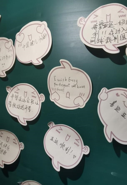 在参与答题和交谈之后,同学们在寄语板上留下了自己对亚运会以及运动员们的期待和祝福,用真挚的语言为亚运会助力。一张张寄语,代表了一位位浙师人的美好祝愿,句句都是对亚运的期待与支持。