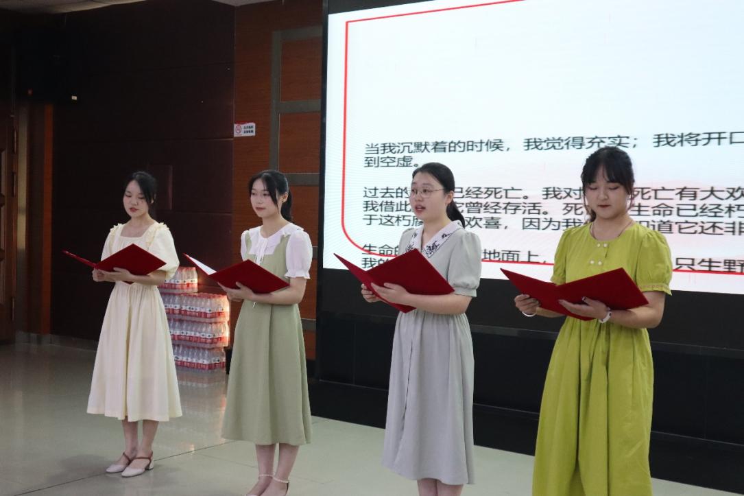 “诗咏年华,颂扬新韵”——备稿朗诵环节,“愿我中国青年摆脱冷气”第四小组带来了一首《野草》题辞。四位选手结合“充实与空虚”“沉默与开口”“生长与腐朽”等成对的意象,准确把握了诗歌的思想感情;朗诵节奏把握准确,抑扬顿挫,起伏有序,极富表现力,深刻表达了中国青年誓同丑陋罪恶作斗争和彻底革命的决心。