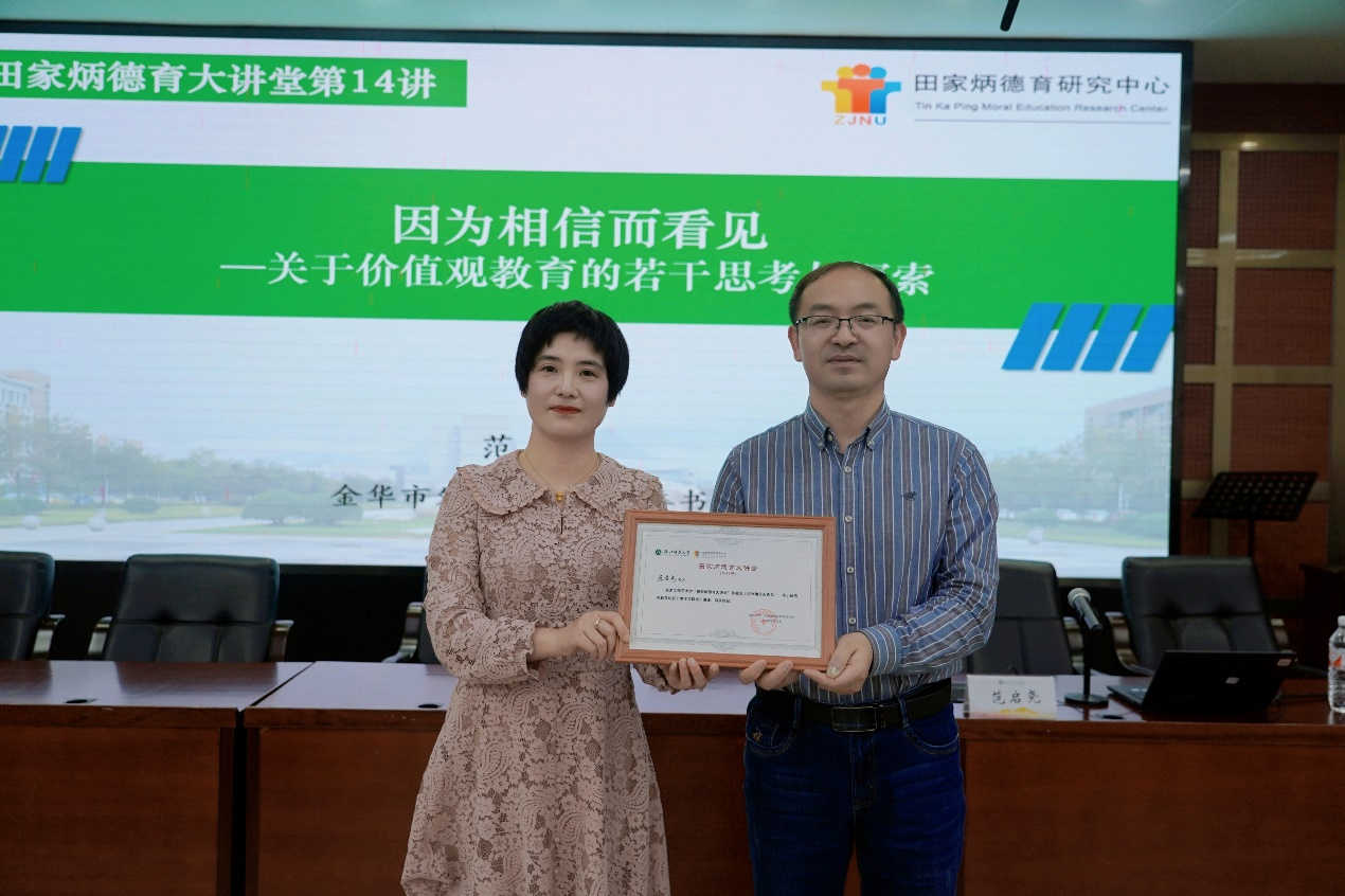 2024年4月25日下午,“田家炳德育大讲堂”第十四讲在浙江师范大学17幢112报告厅举行。金华市外国语学校党委书记、全国特色教育(德育)先进工作者范启尧作了题为“因为相信而看见——关于价值观教育的若干思考与探索”的讲座,讲座由中心刘小柳博士主持,中心常务副主任查颖教授、儿童道德发展研究所所长李庆功教授以及百余位在校师生聆听了本次讲座。
