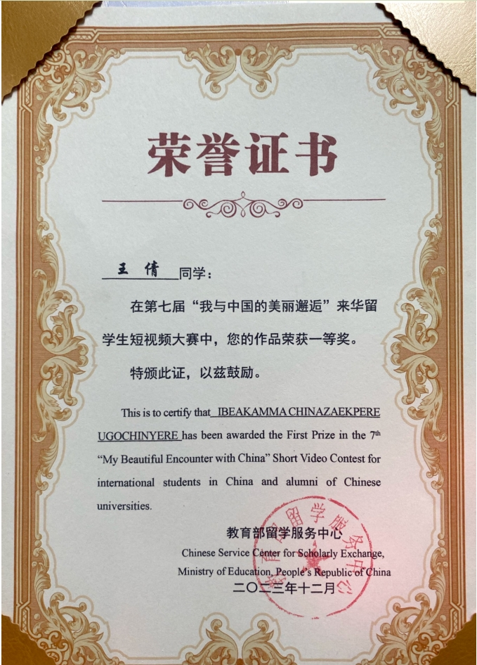 近日,由教育部国际交流与合作司指导、教育部留学服务中心主办的第七届“我与中国的美丽邂逅”来华留学生征文暨短视频大赛颁奖典礼及系列发布仪式在北京举行。我院国际学生王倩凭借短视频《用心用情·讲述真实的中国扶贫故事》荣获一等奖。