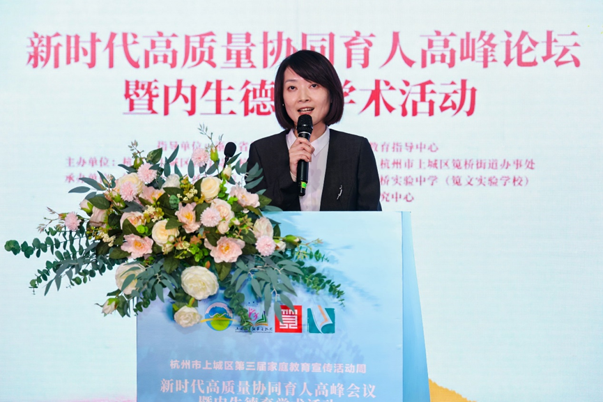 在经验分享环节,浙师大附属杭州笕桥实验中学(笕文实验学校)、笕桥街道、建兰中学学生家长、上城区妇联、家庭教育共同体的代表分别从不同视角分享了育人经验,探寻凝聚家校社协同育人力量,打造上城区协同育人新生态,促进孩子全面健康幸福成长。