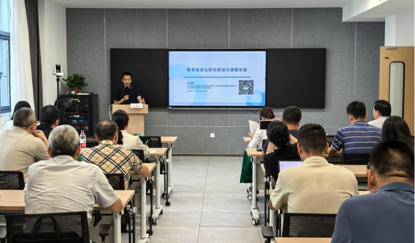 随后,项目负责人、浙江省科普教育研究院副院长阮高峰老师作《教育信息化研究规划及申报建议》专题讲座。阮老师结合多年科研指导与项目评审经验,系统梳理了近年来教育信息化领域的研究热点与发展趋势,并围绕课题申报书的撰写要点展开深入讲解,涵盖研究背景的逻辑构建、研究目标与内容的精准凝练、研究方法的科学选取以及预期成果的合理规划等方面。通过典型案例剖析,他指出了申报过程中的常见误区,并提出一系列具有实操性的优化建议,有效助力学员提升科研规范意识与专业表达能力。