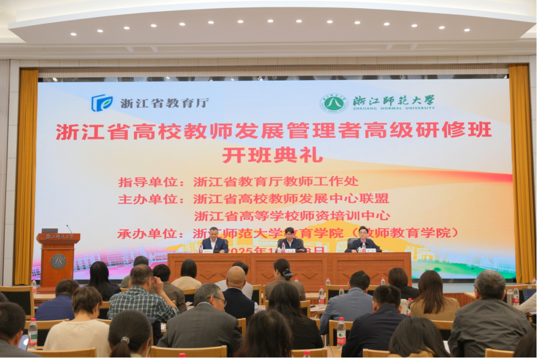 10月28日,由浙江省教育厅教师工作处指导,浙江省高校教师发展中心联盟和浙江省高等学校师资培训中心主办,浙江师范大学教育学院(教师教育学院)承办的浙江省高校教师发展管理者高级研修班在浙江师范大学正阳楼会议中心开班,省教育厅教师工作处副处长赵典、浙江师范大学副校长林一钢出席并致辞,开班仪式由浙江省高等学校师资培训中心常务副主任、浙师大继续教育与合作办学管理处处长钱旭升主持。