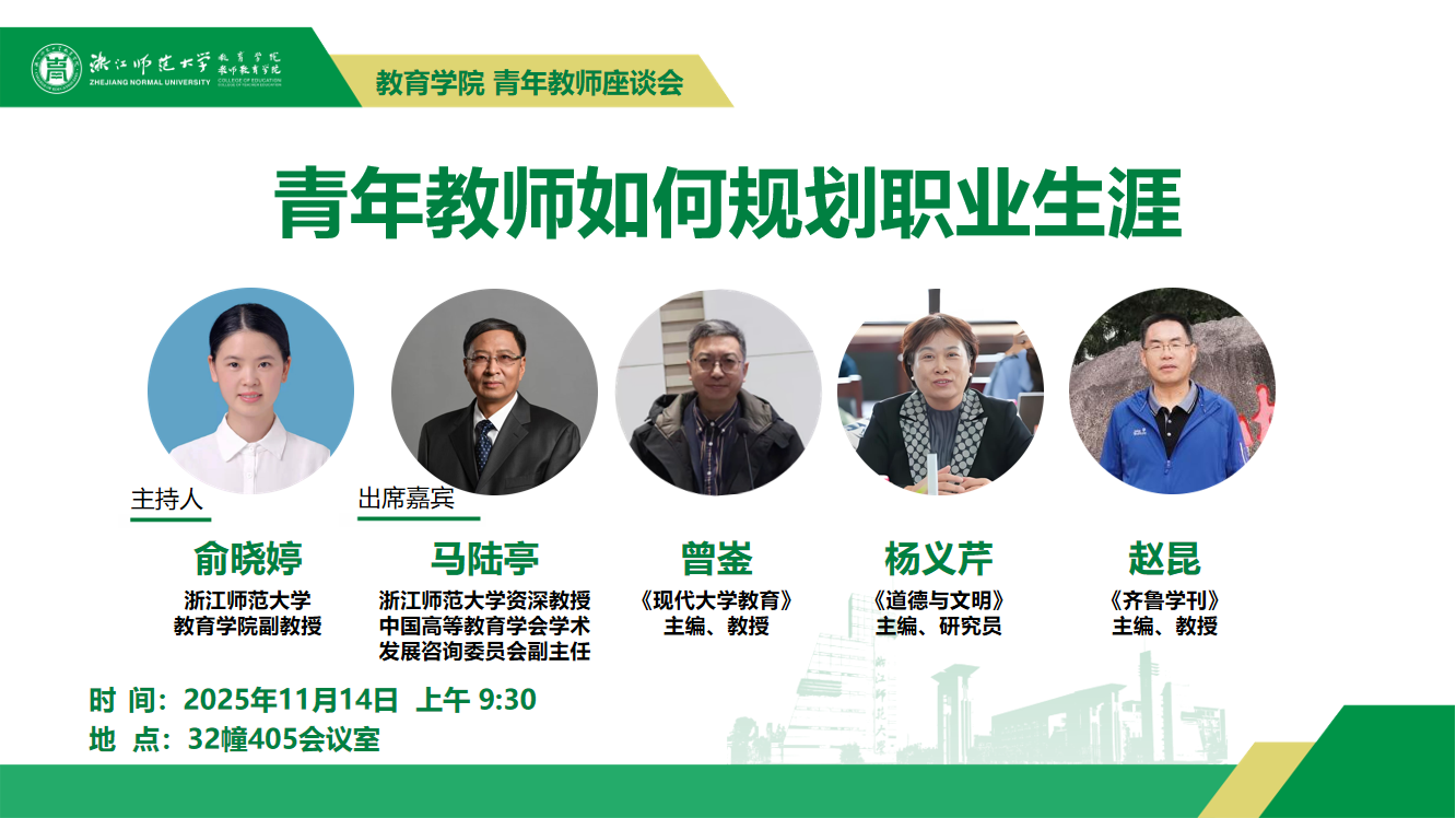 2025年11月14日(周五)上午9:30,浙江师范大学资深教授、中国高等教育学会学术发展咨询委员会副主任兼秘书长马陆亭教授,《现代大学教育》主编曾崟教授,《道德与文明》主编杨义芹教授,《齐鲁学刊》主编赵昆教授,将于32幢405会议室,主讲教育学院青年教师座谈会《青年教师如何规划职业生涯》,浙江师范大学教育学院俞晓婷副教授主持。欢迎广大师生踊跃参加!