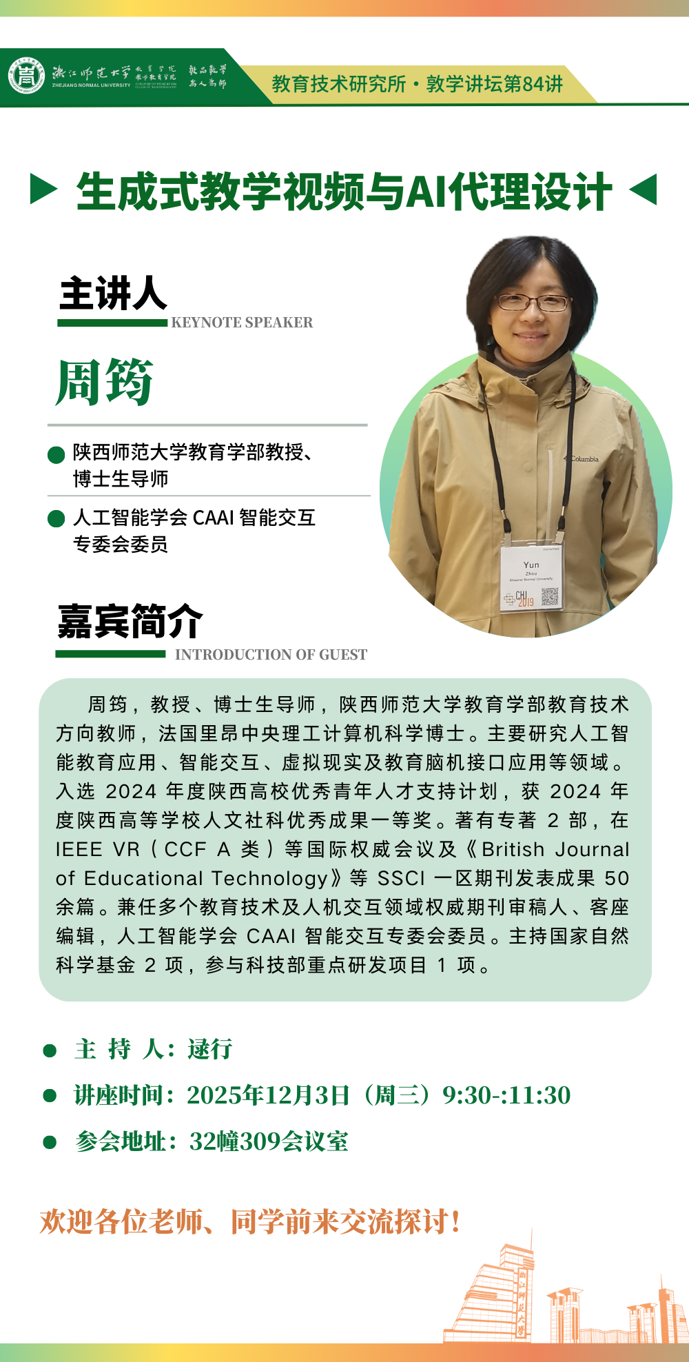 2025年12月3日(周三)上午9:30,陕西师范大学教育学部教育技术方向教授、博士生导师、法国里昂中央理工计算机科学博士周筠教授将于32幢309会议室,主讲教育技术研究所系列讲座暨敦学讲坛第84讲《生成式教学视频与 AI 代理设计》。欢迎广大师生踊跃参加!