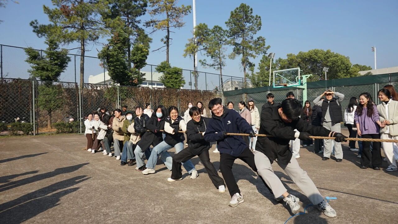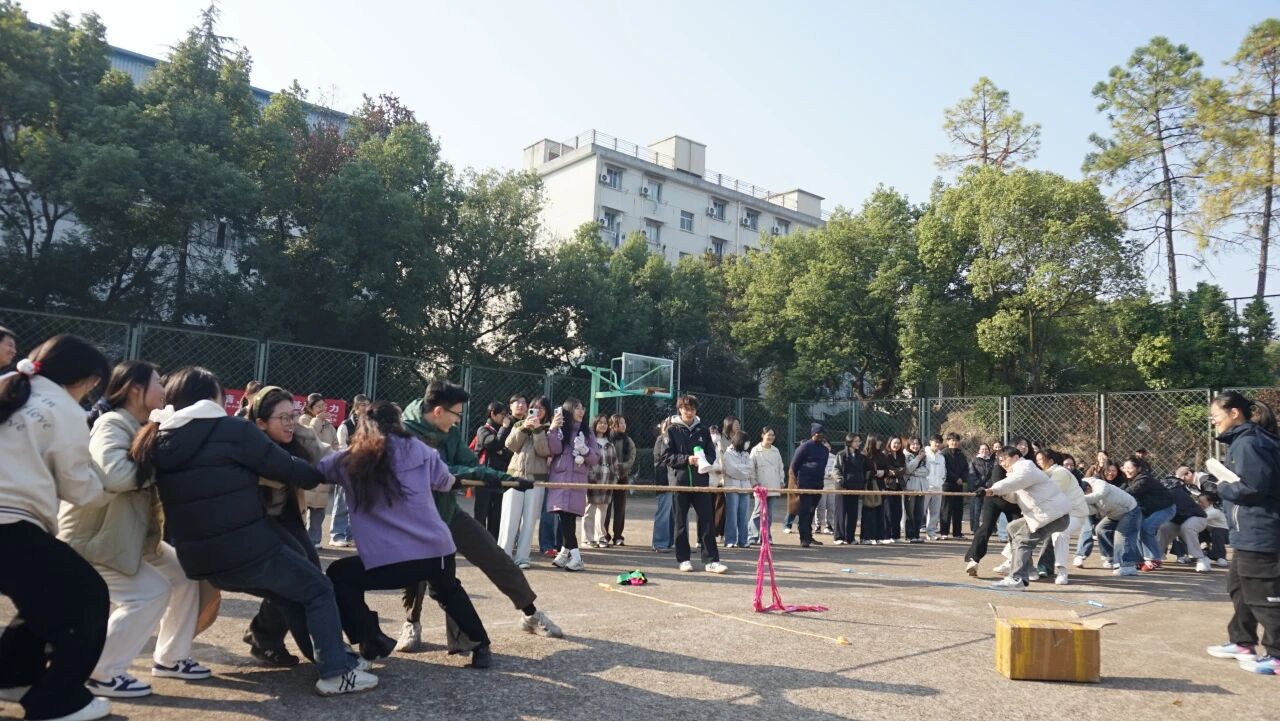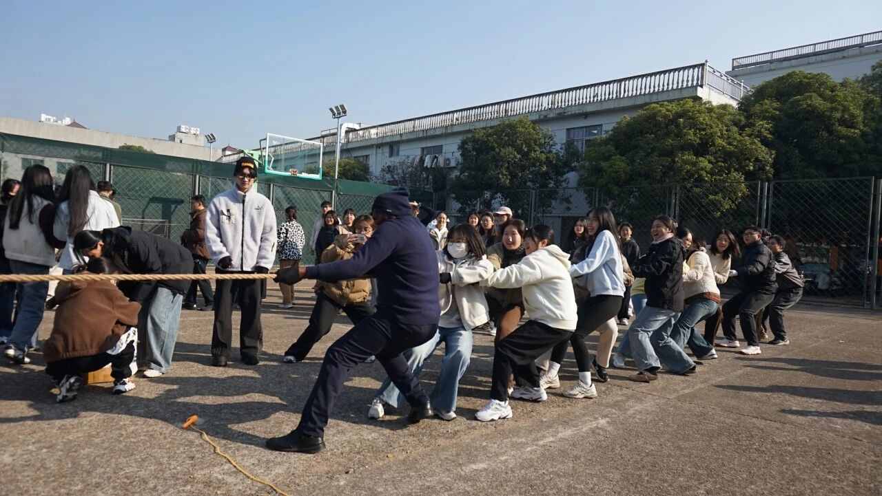 现场气氛热烈,既有参赛选手的摩拳擦掌,也有围观同学的加油助威,充满了青春的活力。随着裁判一声令下,两两对决正式开始。参赛队员们紧握绳索,身体后倾,****往后拉。他们咬紧牙关,脸上写满了坚毅,每一支队伍都在为了集体的荣誉拼尽全力。绳索上的红绸带在两队之间来回移动,每一次的拉扯都牵动着在场所有人的心跳。围观的同学们更是热情高涨,加油声、呐喊声此起彼伏,为选手们注入了源源不断的动力。