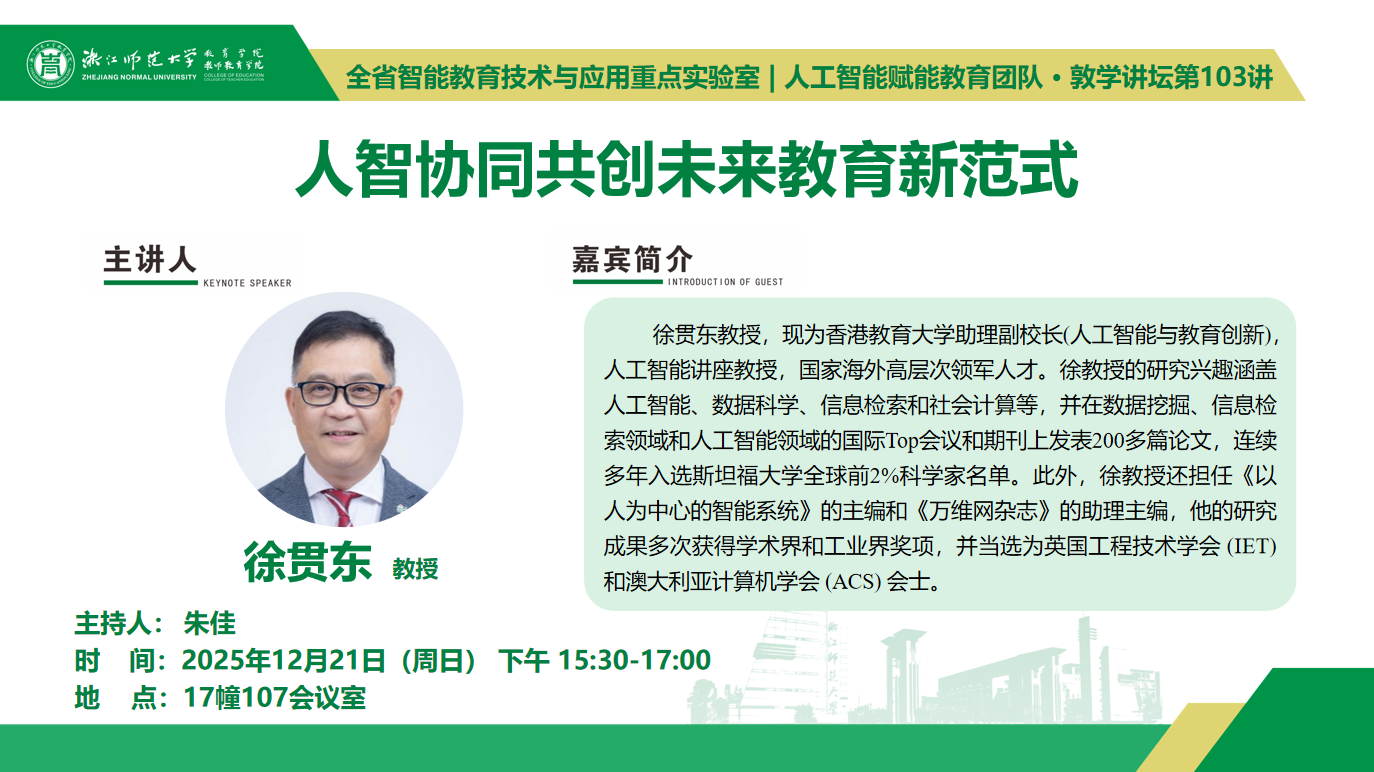12月21日(周日)下午15:30,香港教育大学助理副校长(人工智能与教育创新)、人工智能讲座教授、国家海外高层次领军人才、英国工程技术学会(IET) 和澳大利亚计算机学会 (ACS) 会士徐贯东将于17幢107会议室,主讲全省智能教育技术与应用重点实验室、人工智能赋能教育团队系列讲座暨敦学讲坛第103讲《人智协同共创未来教育新范式》。主持人为朱佳教授。
