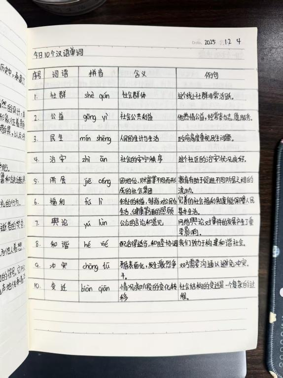 本次为期28日的打卡任务设置两大核心模块,兼顾汉语基础夯实与文化认知拓展。在词汇学习模块,同学们每日解锁10个实用中文词语,涵盖“饺子”“春联”等生活、文化类词汇,以及“中庸”“和气”等承载传统理念的词语。每个词语附有拼音标注、例句示范和趣味记忆口诀,让词汇积累不再枯燥。
