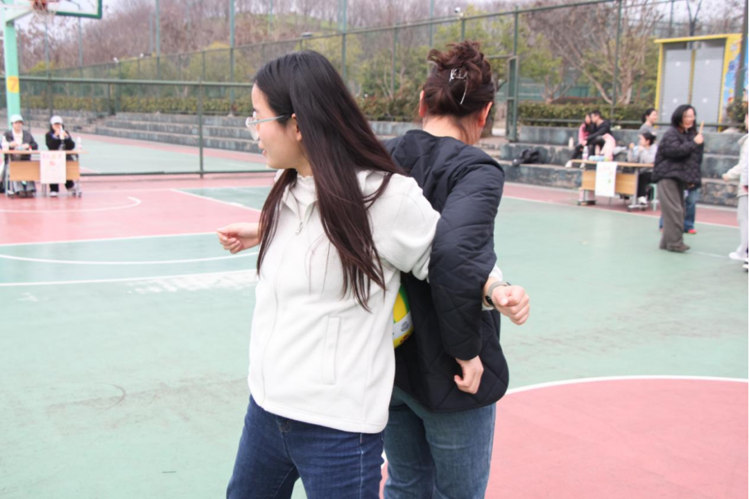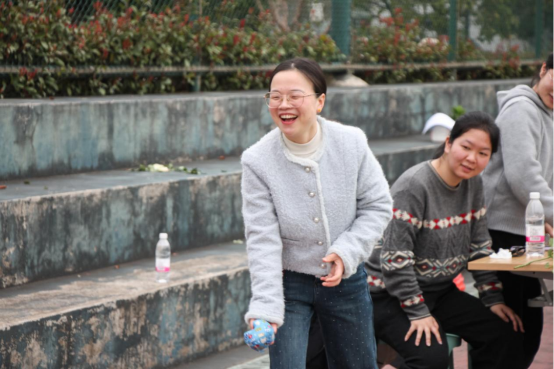 “趣味游戏互动区”则成为了考验默契与展现团队精神的“练兵场”。“两人三足”赛道上,老师们喊着整齐的口号并肩冲刺;“同心接力运彩球”中,四人小组背对背夹球往返,大家屏息凝神、小心挪动,配合天衣无缝;“一圈到底”的呼啦圈在队伍中飞速传递,队员们弯腰、抬臂、侧身,动作行云流水。此外,跳房子前笑语连连,翻花绳两人对坐,指尖翻飞的彩绳与轻盈的跃动让人仿佛重回青葱岁月。