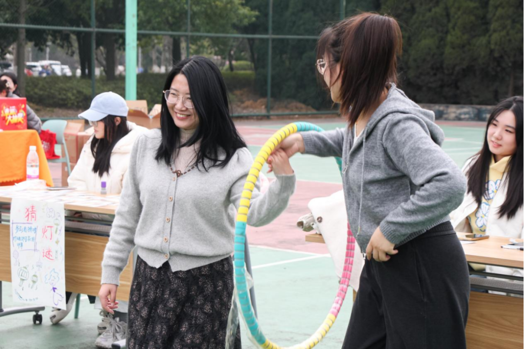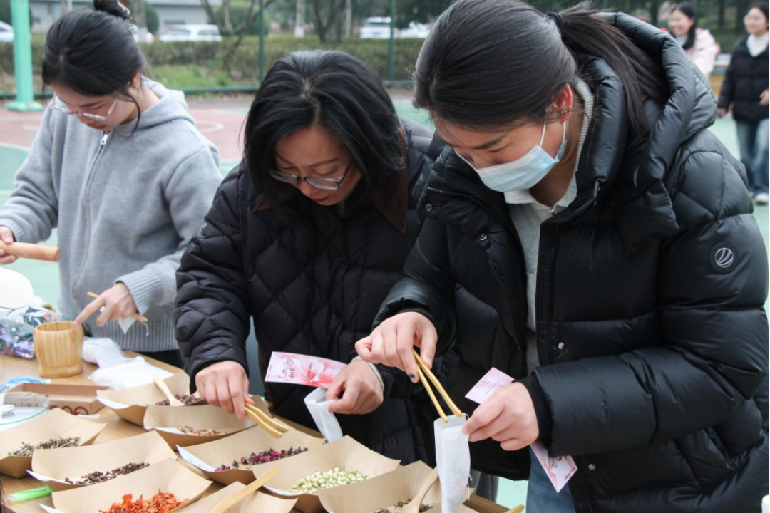 在巧手工坊内,中药香囊制作区香气袅袅。女教职工们将艾草、薄荷等药材细致地缝入布囊,一针一线间传递着对健康与幸福的美好祈愿。知识灯谜会前人头攒动,大家或凝神思索,或热烈讨论,猜中者的欢呼声此起彼伏。不远处的“盲人击鼓”与“欢乐投靶”环节同样充满欢声笑语,蒙眼转圈后的踉跄步伐,以及沙包精准落靶的瞬间喝彩,让整个场地洋溢着轻松愉悦的节日氛围。