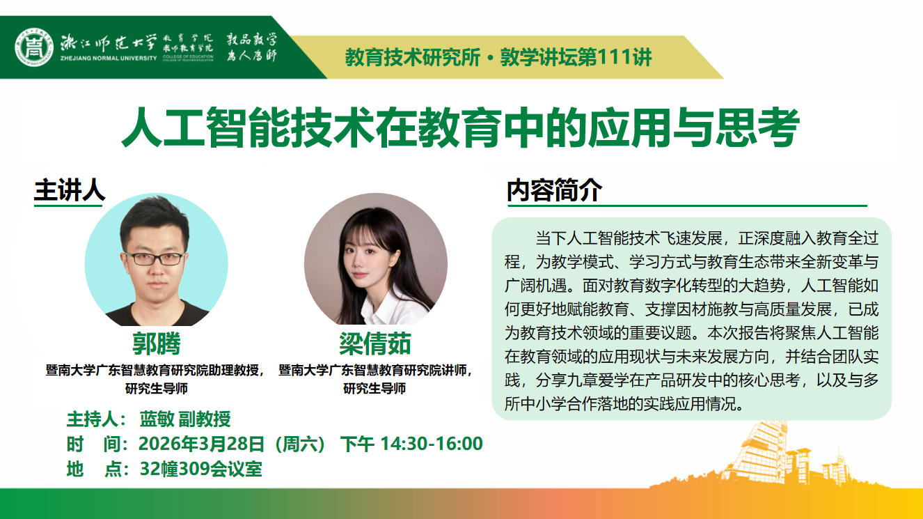 【讲座预告】郭腾、梁倩茹主讲敦学讲坛第111讲:《人工智能技术在教育中的应用与思考》
