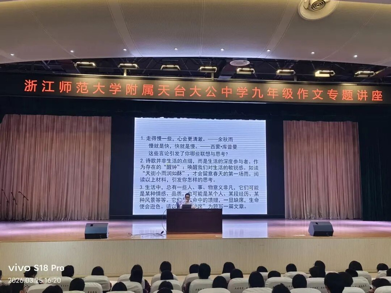 3月25日,浙江师范大学教育学院(教师教育学院)外派联系专家张禄佳特邀温州市知名教师杨建晓,赴浙江师范大学附属天台大公中学开展中考作文专题讲座。