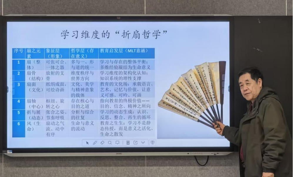 在核心演讲环节,祝智庭教授打破传统的线性认知,阐释了意义主义学习的两大公理——“学习即消弭不确定性”与“成功的学习滋生更多新的不确定性”,将学习定义为动态的“生机—迭代”过程。为了使高深理论通俗易懂,他在理论阐释中借助富有东方美学意蕴的“折扇哲学”,并结合AI大模型“豆包”生成文本的案例,形象说明了“意义涌现”的生成机制。同时,他通过“苏格拉底圆圈”的隐喻,生动揭示了“知之愈多,其惑愈广”的认知规律,引发在场师生的广泛共鸣。