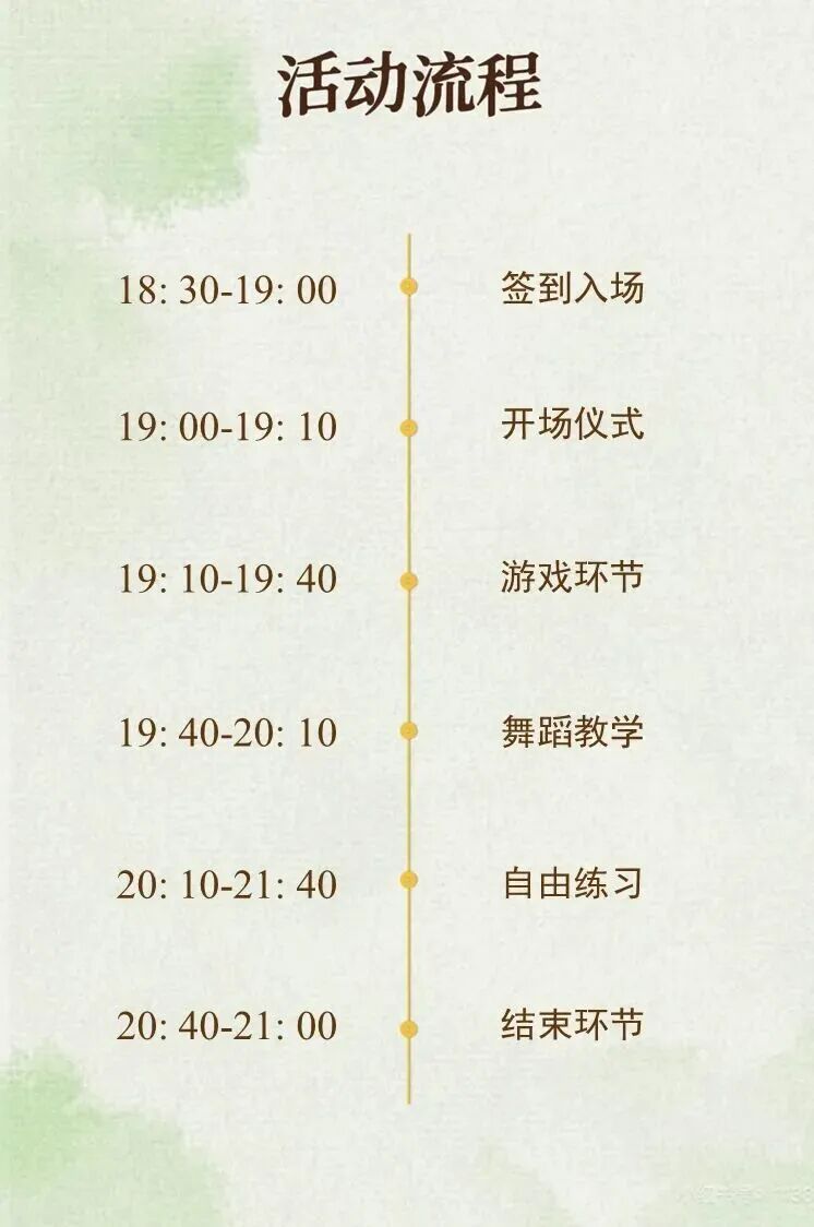 2 我们不硬性规定着装,建议女生穿长裙,男生穿衬衫,一切以你的舒适和愉悦为先,但请勿穿拖鞋、睡衣进入场馆,一起在舞步中感受春日的温柔与热烈。