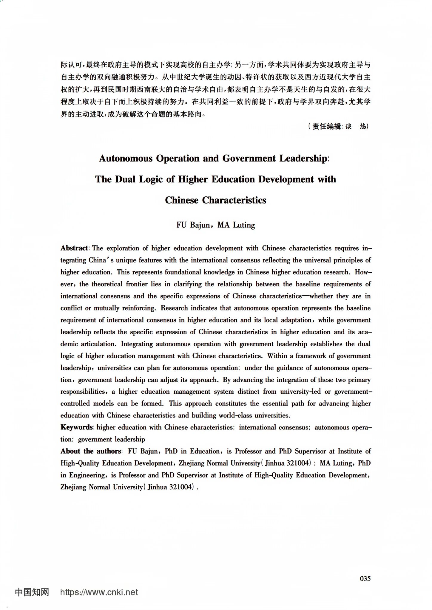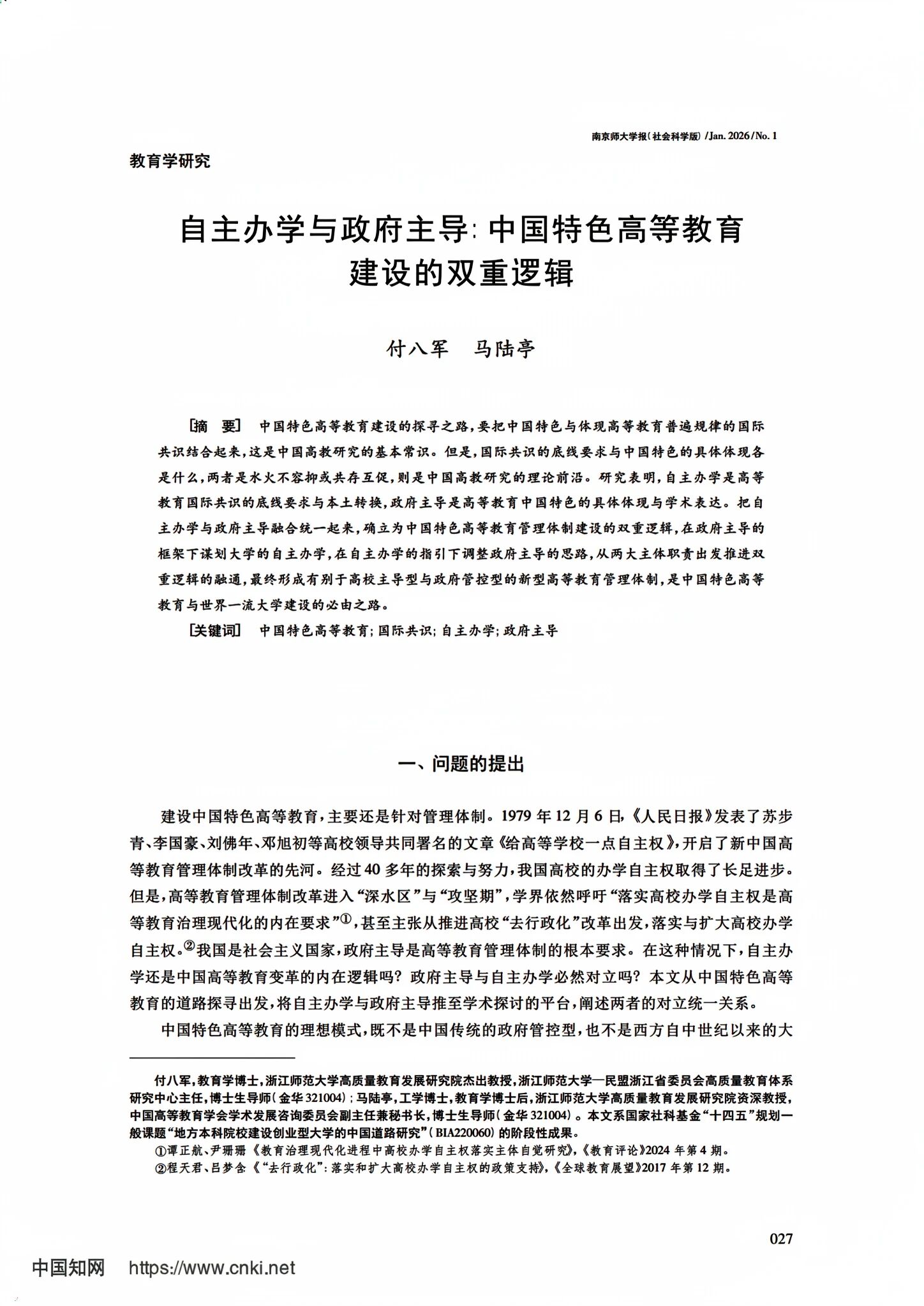 近日,教育学院(教师教育学院)付八军与马陆亭两位教授在《南京师大学报(社会科学版)》2026年第1期发表了《自主办学与政府主导:中国特色高等教育建设的双重逻辑》一文。该文的学术贡献有三:一是将高等教育的国际共识从“三A原则”一步一步推导到中国语境的“自主办学”,确立了自主办学是高等教育国际共识的底线要求与本土转换;二是在文献梳理的基础上明确提出“政府主导”是中国特色高等教育管理体制的具体体现与学术表达;三是提出了中国特色高等教育管理体制的建设,要把具有必然性的“政府主导”与具有必要性的“自主办学”统合起来,同时为该双重逻辑的融通寻找理论依据与实践佐证,并从大学教师与高校领导两大主体视角出发提供建设性的融通之策。