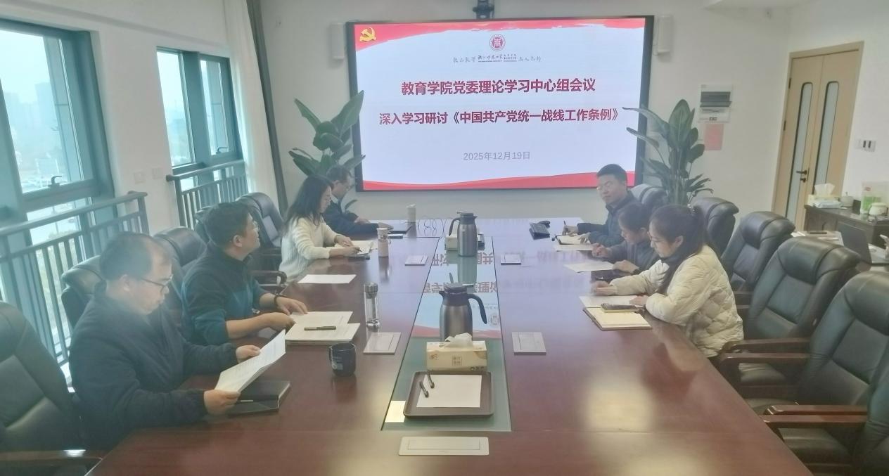 2025年12月19日下午,教育学院(教师教育学院)党委理论学习中心组在32幢405会议室举行“深入学习研讨《中国共产党统一战线工作条例》”专题学习会。会议由学院党委书记苏煜主持,学院党委理论学习中心组成员及相关教师代表参加。