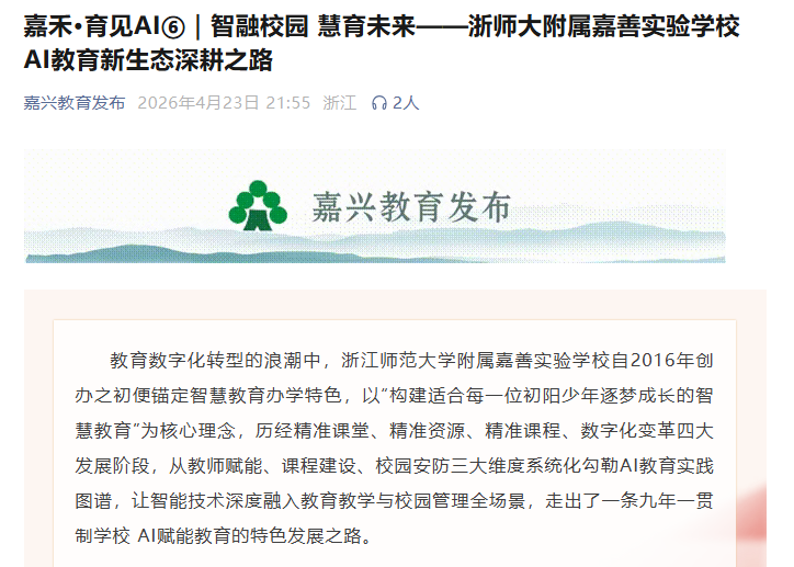 浙江师范大学教育学院(教师教育学院)与浙江师范大学附属嘉善实验学校合作办学成果获“嘉兴教育发布”官方微信公众号专题宣传报道,全面展现了学校AI智慧教育的办学特色与实践成效。