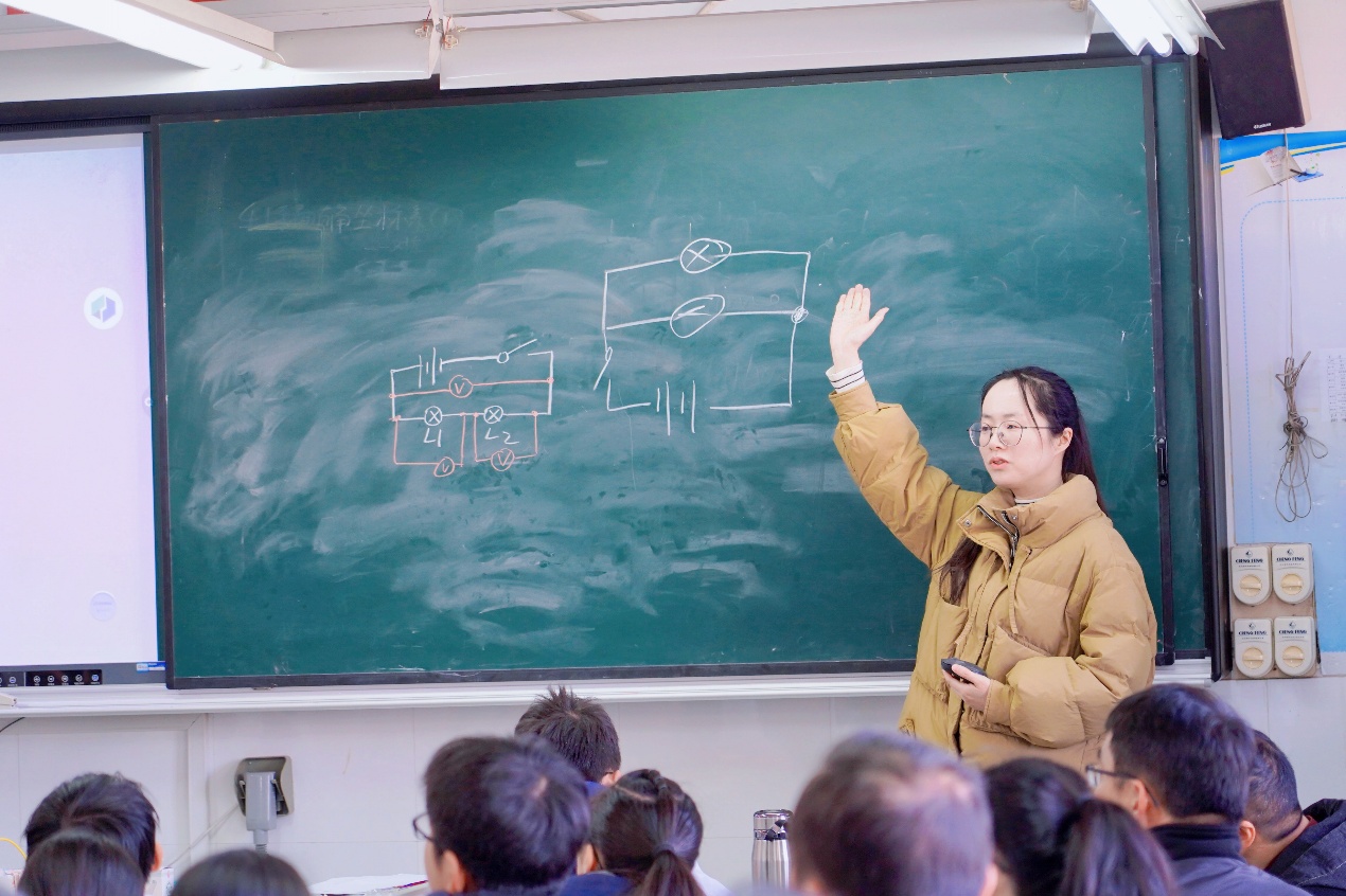 朱红指出蒋佳辰主讲的《串联、并联电路的电压特点》一课,以实验探究为核心教学方式,遵循“复习铺垫—猜想假设—方案设计—实验验证—归纳总结”的科学探究流程。课程开篇先复习串并联电路的基本结构与电流特点,为新知识学习搭建认知桥梁;随后抛出“串并联电路电压具有怎样特点”的核心问题,引导学生类比生活中“水压”现象形成初步猜想,充分调动已有经验。在方案设计环节,学生自主思考实验器材选择、操作步骤规划,通过小组展示交流、相互评价补充优化方案;接着利用家庭实验包开展实操,在连接电路、测量电压、记录数据的过程中积累实证材料;最后通过分析实验数据,归纳总结出串并联电路的电压规律。整堂课以学生为主体,教师仅在关键环节给予启发引导,学生全程参与自主探究、合作交流,真正实现“做中学、学中思”,有效提升逻辑推理、数据分析等高阶思维能力,深化科学探究素养。
