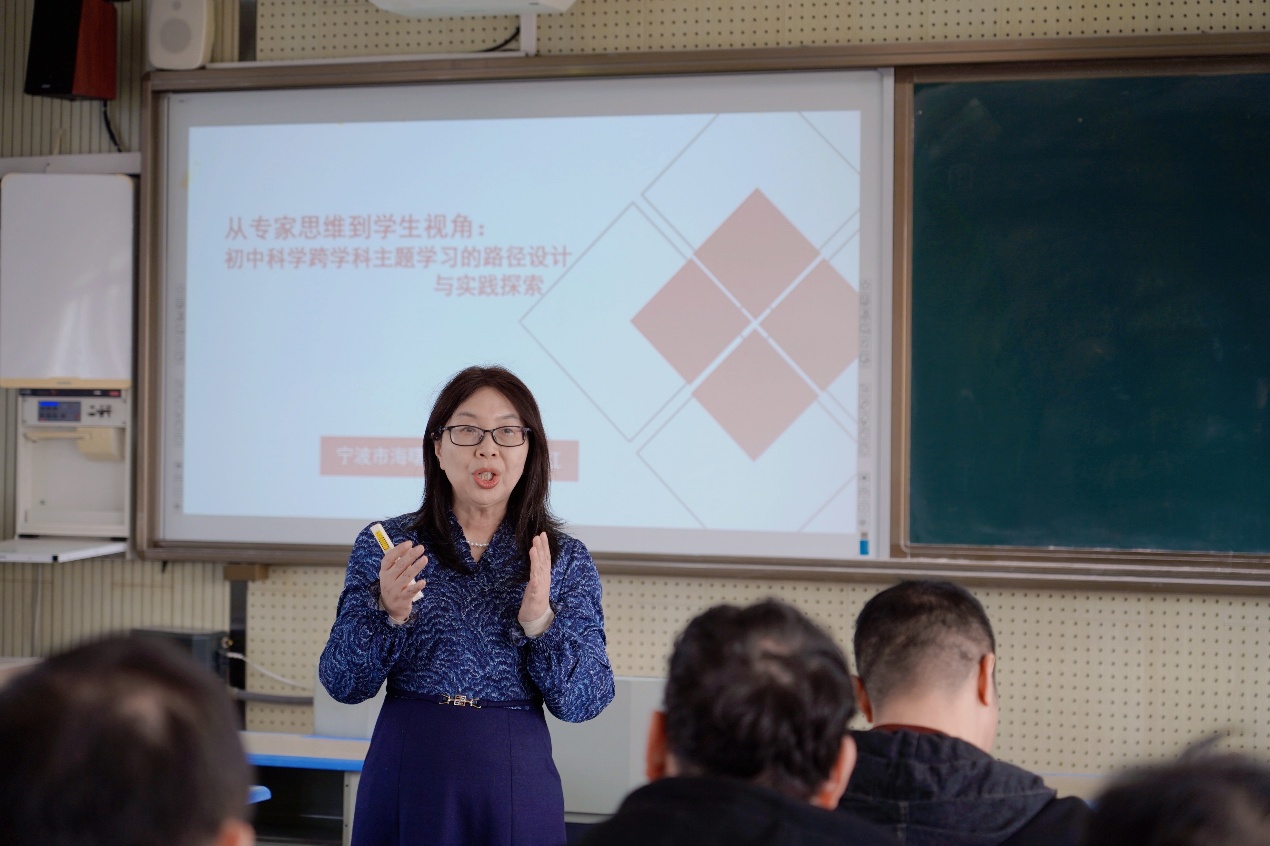 朱红以“从专家思维到学生视角:初中科学技术工程实践的路径设计与实施”为题开展讲座,系统阐释跨学科主题学习的内涵特征、核心价值与设计实践路径,为一线教学提供清晰指引。她指出,跨学科主题学习的实施具有三重关键意义:一是学生应对复杂现实世界的必然要求,需整合多学科知识、方法与思维工具解决实际问题;二是“双新”背景下的课程刚性规定,课程方案明确跨学科主题学习课时占比不少于10%;三是核心素养落地的重要载体,尤其能有效培育学生的高阶思维与实践创新能力。她强调,跨学科主题学习需立足学生认知实际,以科学学科为锚点,融合多学科知识、方法与思维破解真实情境问题,最终指向核心素养培养。此类学习具备五大核心特征:依托真实情境、围绕驱动性问题、设计系列化任务、聚焦高阶思维培育、构建多元评价机制。朱红还以“设计制作电磁扬声器”“制作暖宝宝”为典型教学实例,生动演示如何将专家思维转化为学生视角——通过简化复杂流程、转化专业方法、增补支撑资源,助力学生突破解题难点。她提出跨学科主题方案设计五步法:明确核心问题与最终产品形态、梳理专家解决问题的完整流程、转化为学生可操作的任务清单、归组任务形成系统学习框架、优化学习标题与核心活动设计。