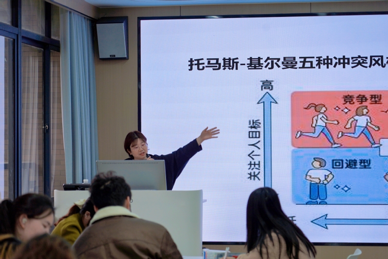 最让同学们上头的,当属冲突风格“动物趣味大闯关”!托马斯-基尔曼五种冲突风格,被程老师化身成超萌动物形象,瞬间告别枯燥理论:遇事就躲的“鸵鸟型(回避型)”、硬刚到底的“犀牛型(对抗型)”、友好协商的“海豚型(合作型)”,还有绵羊(迁就型)、老虎(竞争型)、狮子(合作型)专属“动物名片”。大家边填名片边分析不同风格的优劣势,再加上现场冲突风格小测试,同学们纷纷精准“对号入座”,笑着直呼“原来我是遇事就佛系妥协的小绵羊”“我竟是硬刚的老虎本虎”,在趣味互动中轻松认清自己的冲突应对习惯。