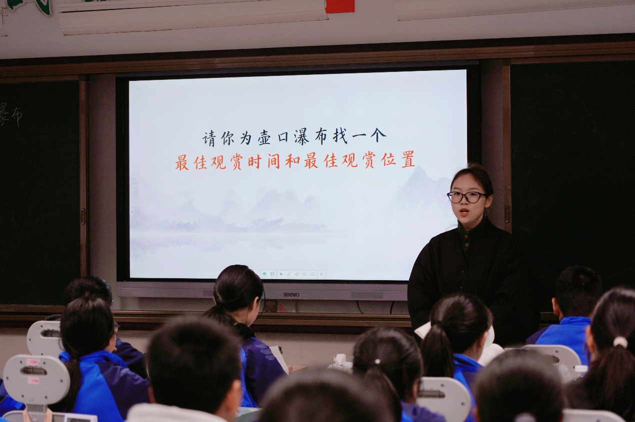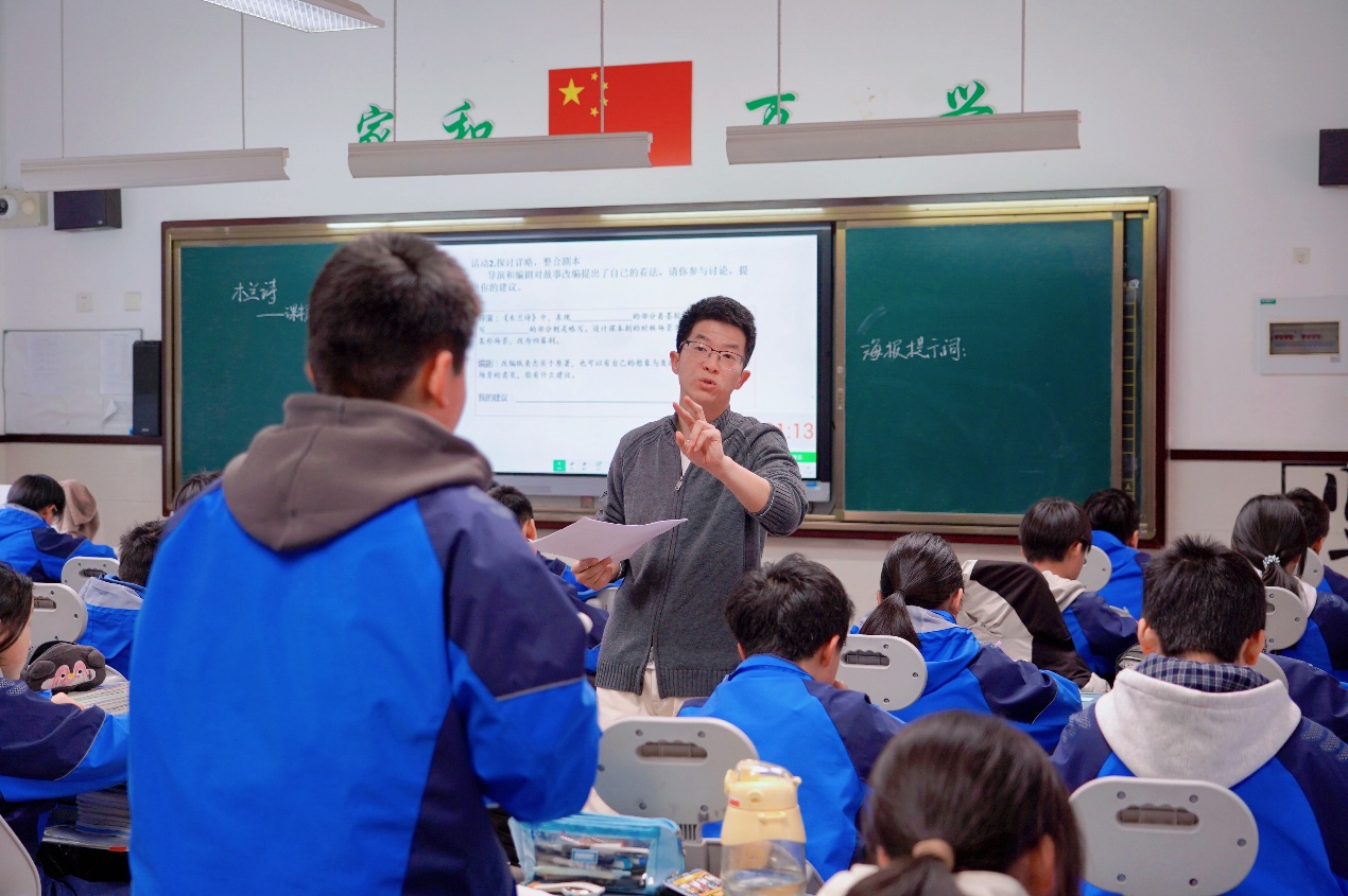锦绣中学祝翠教师充分肯定了两位老师的教学思路与课堂呈现。针对郑雅月老师的《壶口瀑布》课堂,她建议优化板书,可总结游记“所知、所见、所感”的写作方法,重点突出“所见”部分,梳理文中刚劲有力的用词、短句及修辞便于学生更系统地掌握知识。对于郑建飞老师的《木兰诗》课堂,她认为课堂的第二个环节与剧本关联度不足,作业本可作为教学参考,但不能过多依赖,且作业本部分内容值得商榷,建议备课期间结合实际教学需求,灵活合理地运用作业本内容。