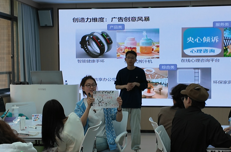 创造力实训同样亮点十足。“广告创意风暴”环节中,同学们分组抽取智能健康手环、便携式榨汁机、在线心理咨询平台等主题,限时头脑风暴、创意设计。从雀巢咖啡趣味广告语到植牙保险创意媒介,经典案例打开创作思路,大家大胆突破思维定式,将新奇想法转化为创意方案,在团队协作中提升创新思维与实践能力。